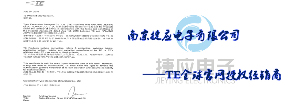 南京捷應(yīng)電子有限公司是國(guó)際無源器件品牌美國(guó)泰科電子(TE)在中國(guó)華東地區(qū)的主要通路商,代理經(jīng)銷旗下全系列產(chǎn)品包括TYCO(AMP)系列連接器、接插件、OEG、SCHRACK、P&B功率繼電器、美國(guó)RACHEM各類航空導(dǎo)線、熱縮套管、?s套、標(biāo)識(shí)產(chǎn)品、電線電纜。